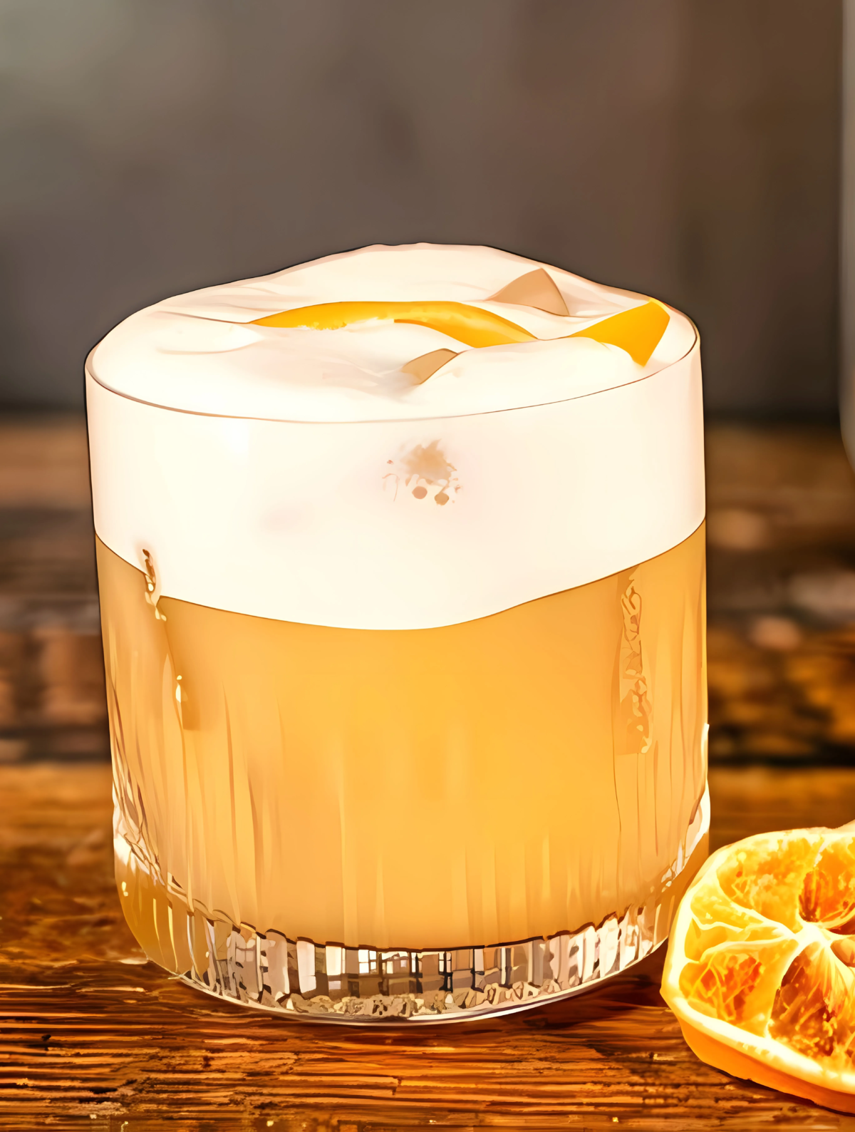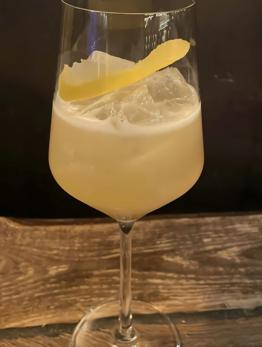 light-yellow-color-in-a-white-wine-glass-lemon-zest-as-garnish-on-wooden-table